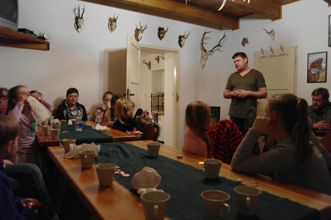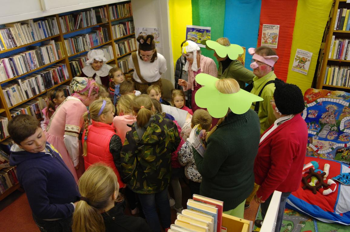 Po promítání jsme se vrátili do naší místní knihovny, kde program pokračoval příchodem skutečných hrdinů Čtyřlístku, kteří si s dětmi povídali, rozdali jim speciální číslo Čtyřlístku, které vyšlo jen pro tuto příležitost, pak všichni skládali mapu pokladu a podle ní se vydali stezkou odvahy do Muzea myslivců a pytláků Na Mýtinku, kde na ně čekal opravdu poklad, a také myslivci, kteří jim poutavě povyprávěli nejen o zvířatech, ale také o myslivcích a pytlácích a provedli je muzeem. Potom jsme se vrátili do knihovny, kde ještě proběhla soutěž v hodnocení nejhezčího pyžamka, a pak už hurá do spacáků! Četli jsme si sami i společně až do půlnoci, nejoblíbenější pohádkovou knihou byla kniha popletených pohádek Teta to plete od spisovatelky Ivony Březinové.