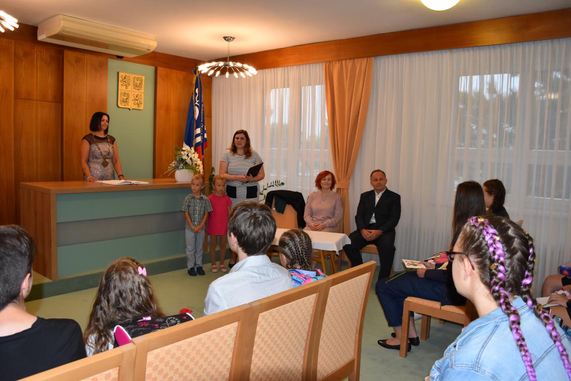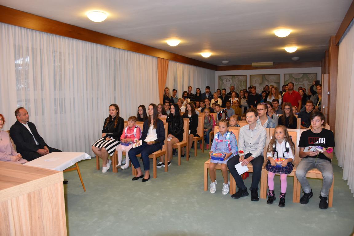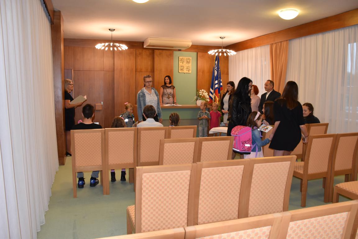Slavnostní přivítání prvňáčků paní starostkou na obecním úřadě za účasti ředitele školy, ředitelky mateřské školy, třídní učitelky nových prvňáčků, rodičů a prarodičů.