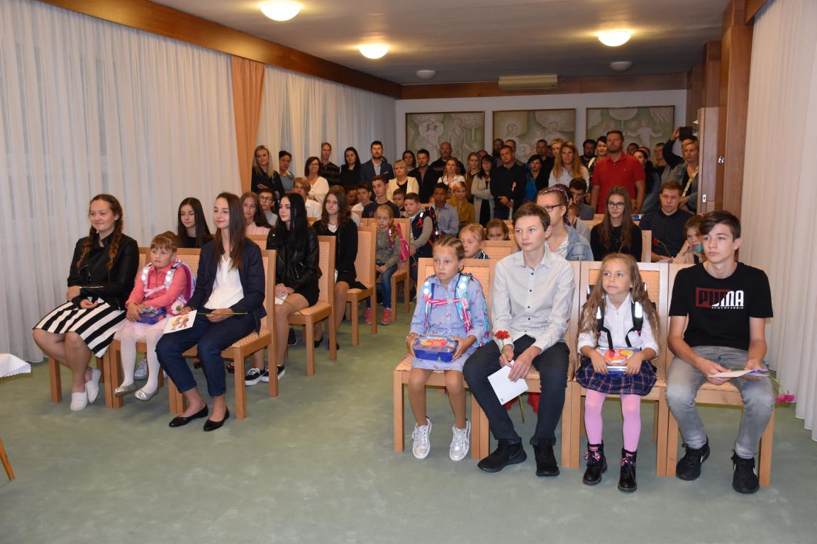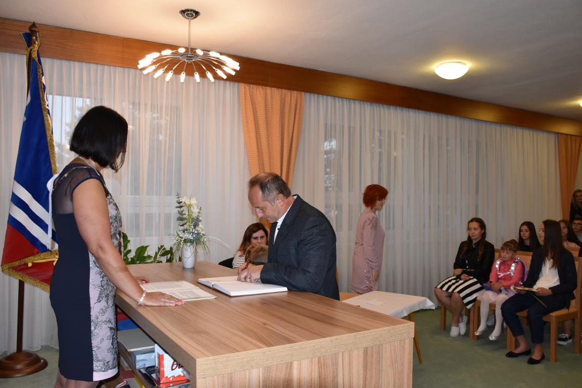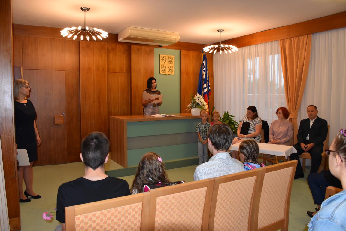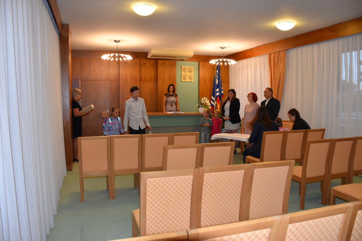 Slavnostní přivítání prvňáčků paní starostkou na obecním úřadě za účasti ředitele školy, ředitelky mateřské školy, třídní učitelky nových prvňáčků, rodičů a prarodičů.