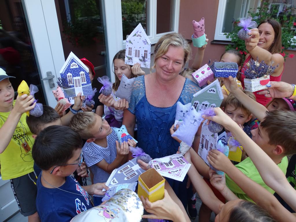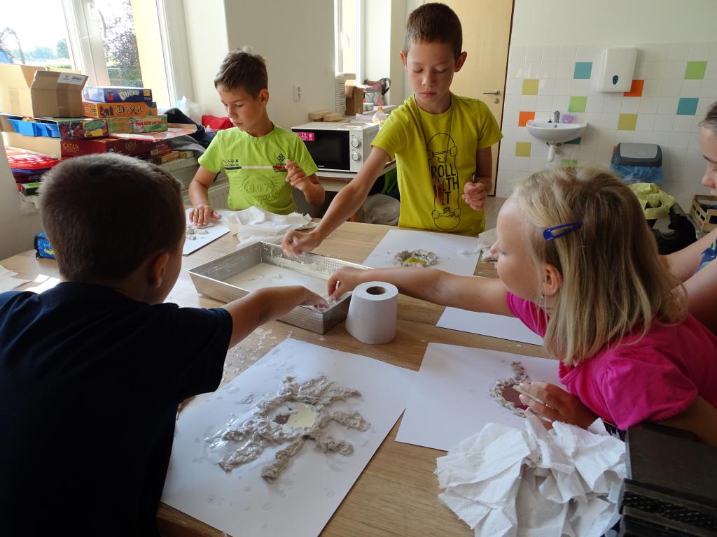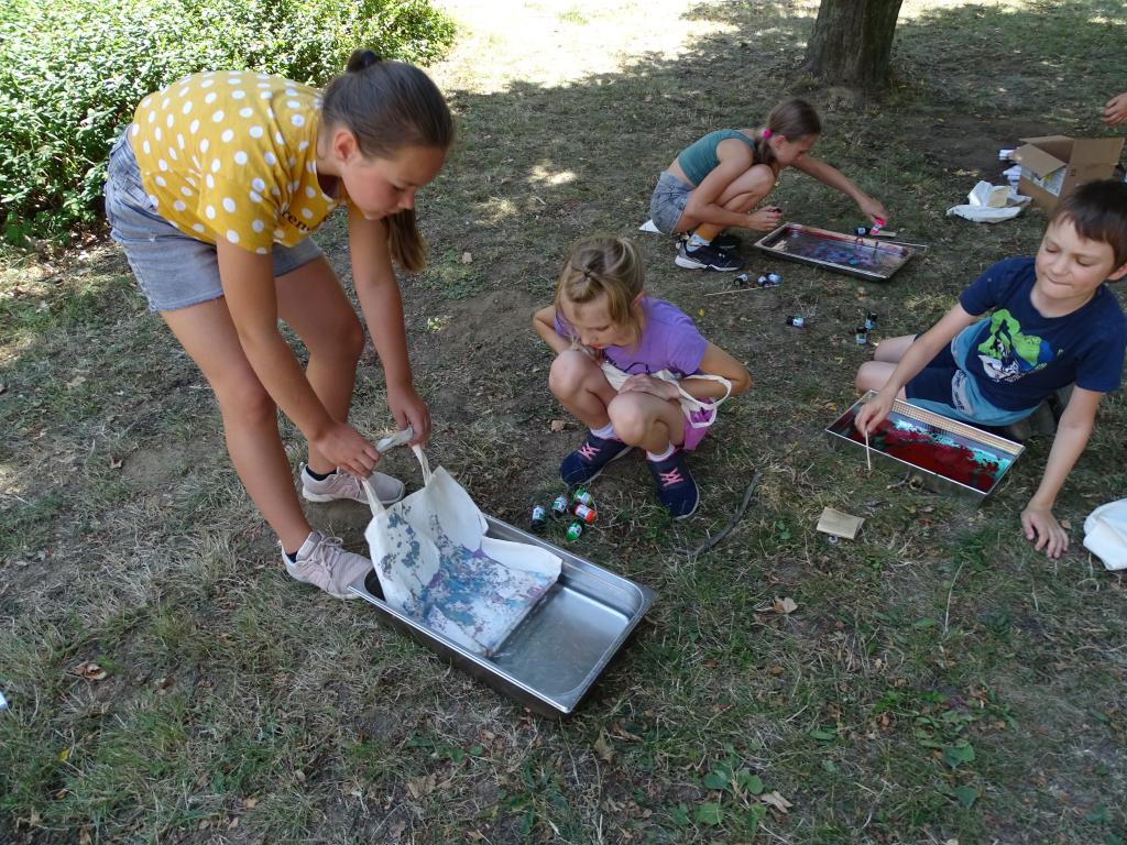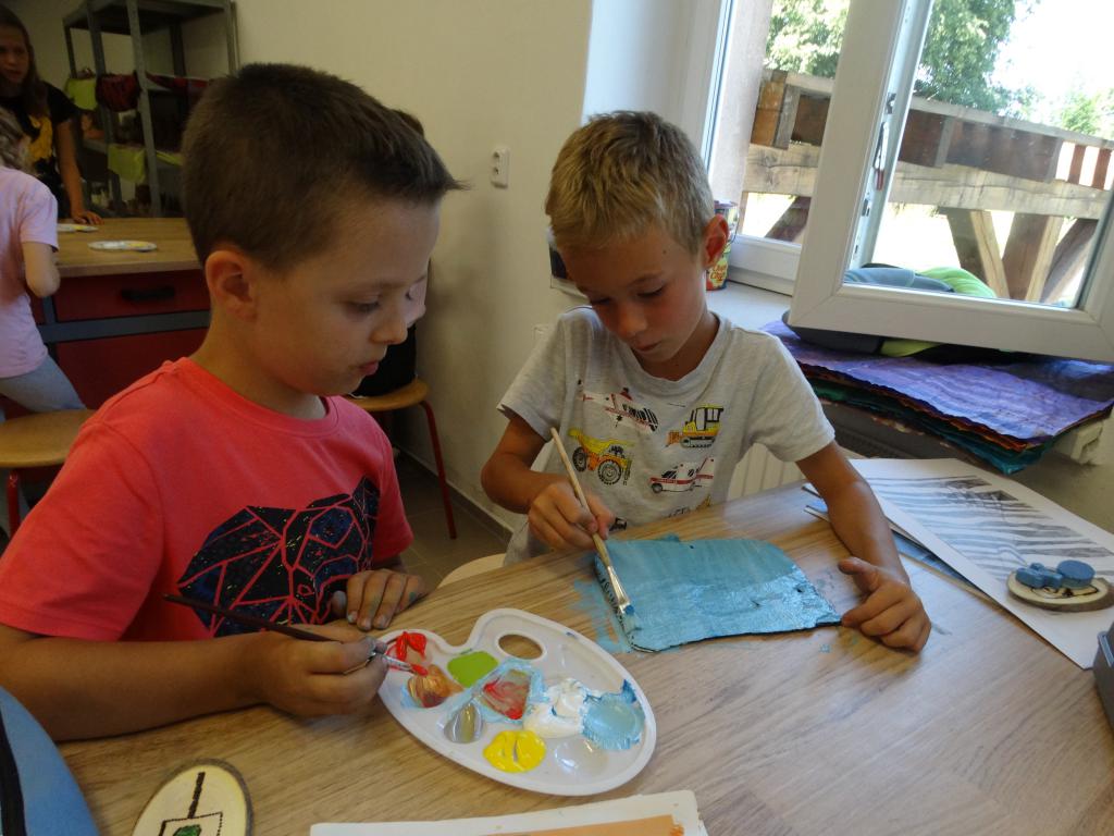 Účastníci tábora si mohli vyzkoušet nepřeberné množství výtvarných technik, až je s podivem, co vše se vešlo do pěti dní. Přes jednoduchou a rychlou kresbu, linoryt, vypalování, modelování závěsných ryb, výrobu mýdel, textilních hraček a dekorací jsme se dostali až k malování na vodní hladině (mramorování), stříkání spreji, rytí do skla či malování na břidlici. Ve středu jsme se stavili v místní knihovně na levandulových dílničkách, které byly hodně o tvoření z textilií. Celý týden jsem se také bavili u netradičních her, vyšli jsme si i do přírody, kde jsme tvořili z přírodnin, učili jsme se vnímat barvy a zkoušeli si jejich míchání. Poslední den po dokončení všech výrobků proběhlo vyhodnocování a odměňování.