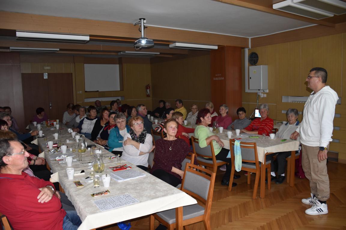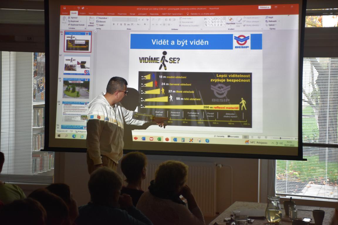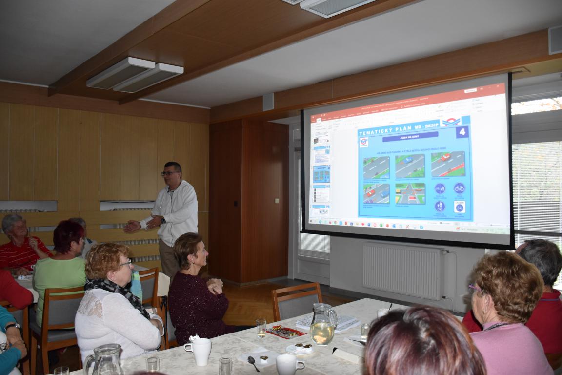 Přednášel krajský koordinátor pro BESIP Zdeněk Patík, který seniory upozornil na různá úskalí, která silniční provoz přináší, ať už se ho účastní jako chodci, cyklisté či řidiči. Také se věnoval způsobům, jak nebezpečným situacím předcházet.