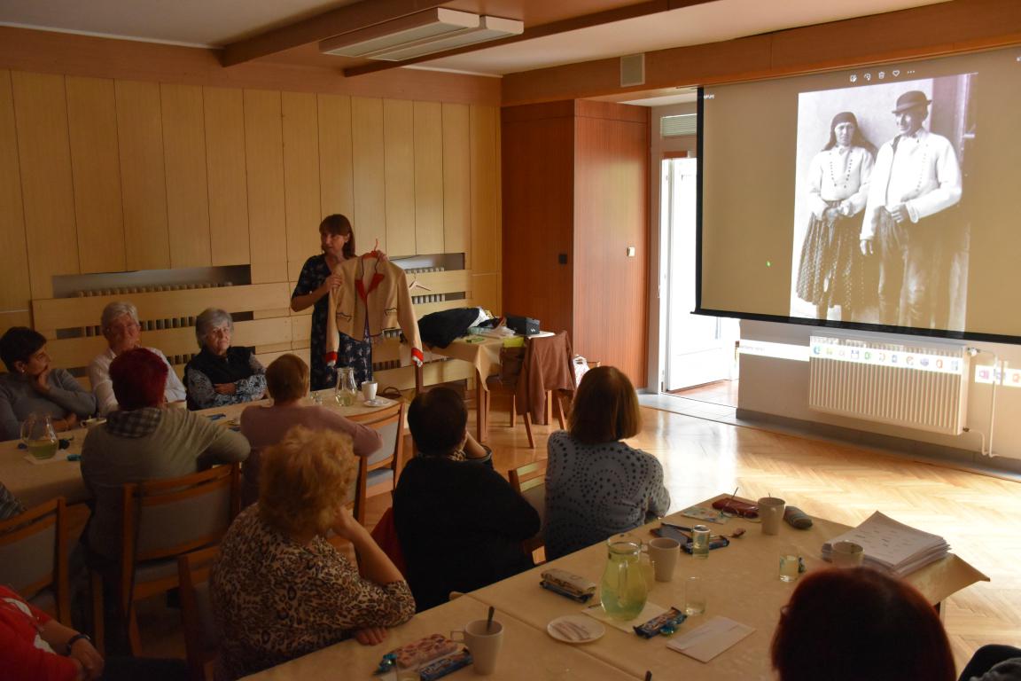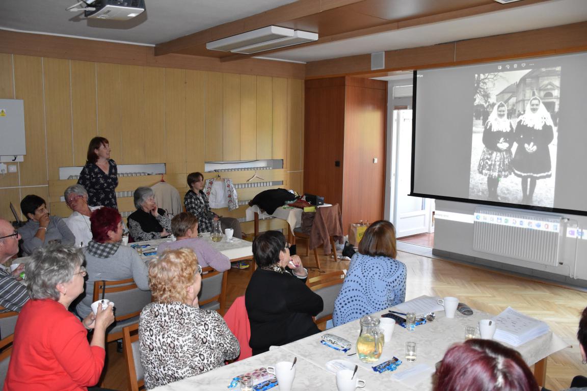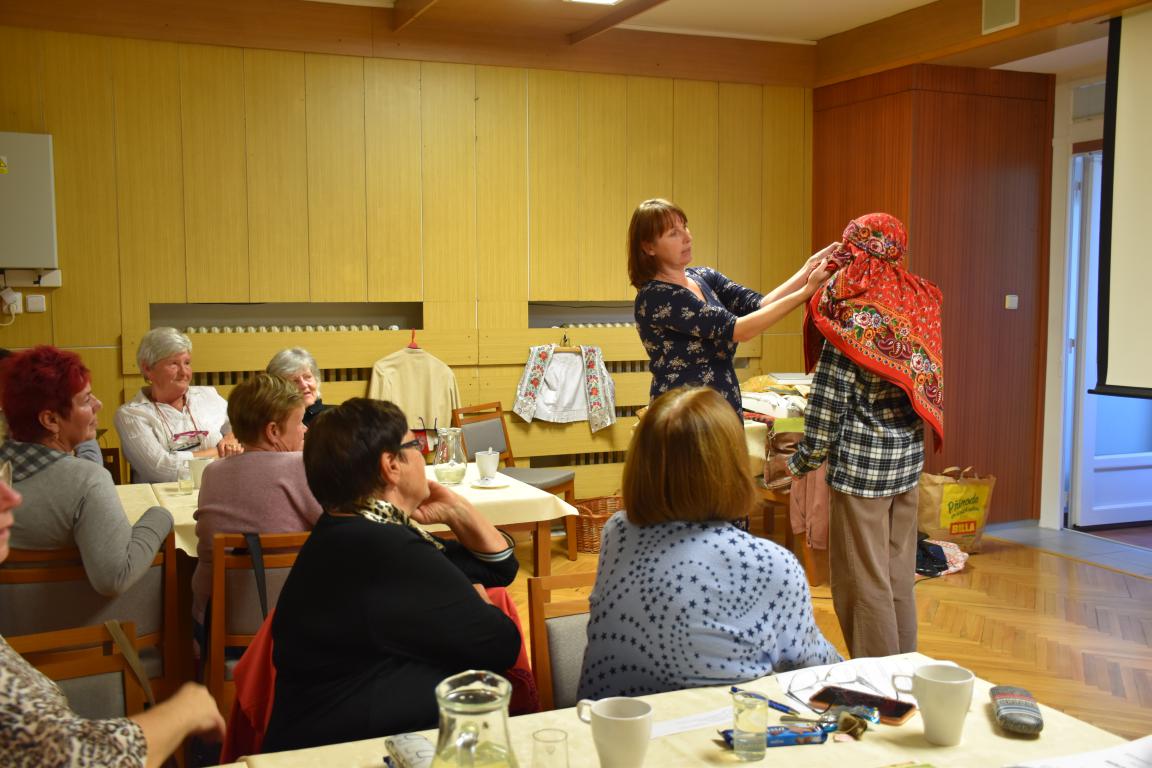 Řeč byla nejen o historii babického kroje, ale i o jeho současnosti. Miroslava Maňásková se mnoho let věnuje folklóru, a v současné době vede DFS Kalinka. Navíc právě ona váže děvčatům šátky turčáky na hody. Ukázku vázání na klubu také předvedla.