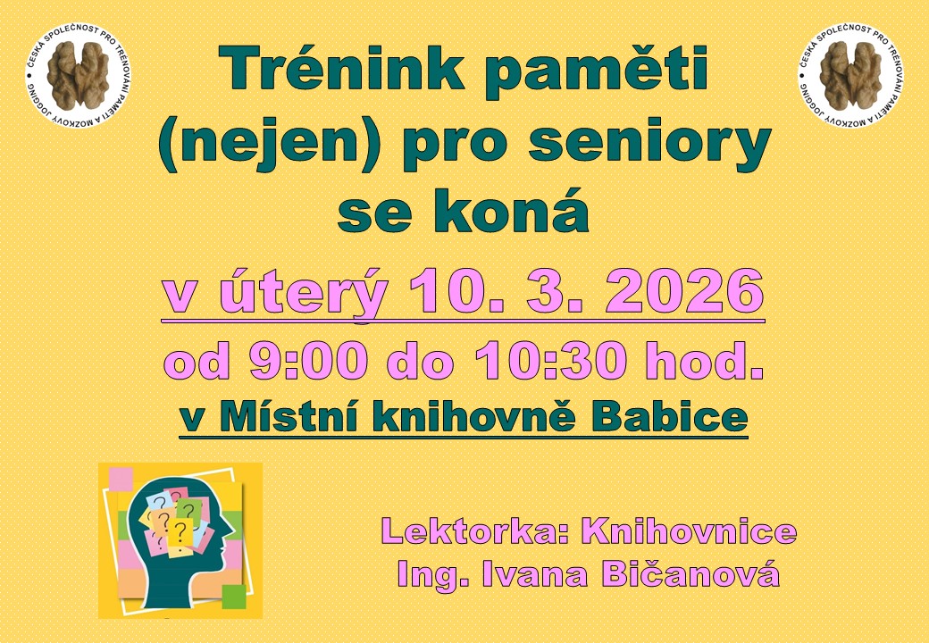 Místní knihovna v Babicích zve nejen seniory na pravidelný trénink paměti do knihovny, tentokrát v úterý 10. března.