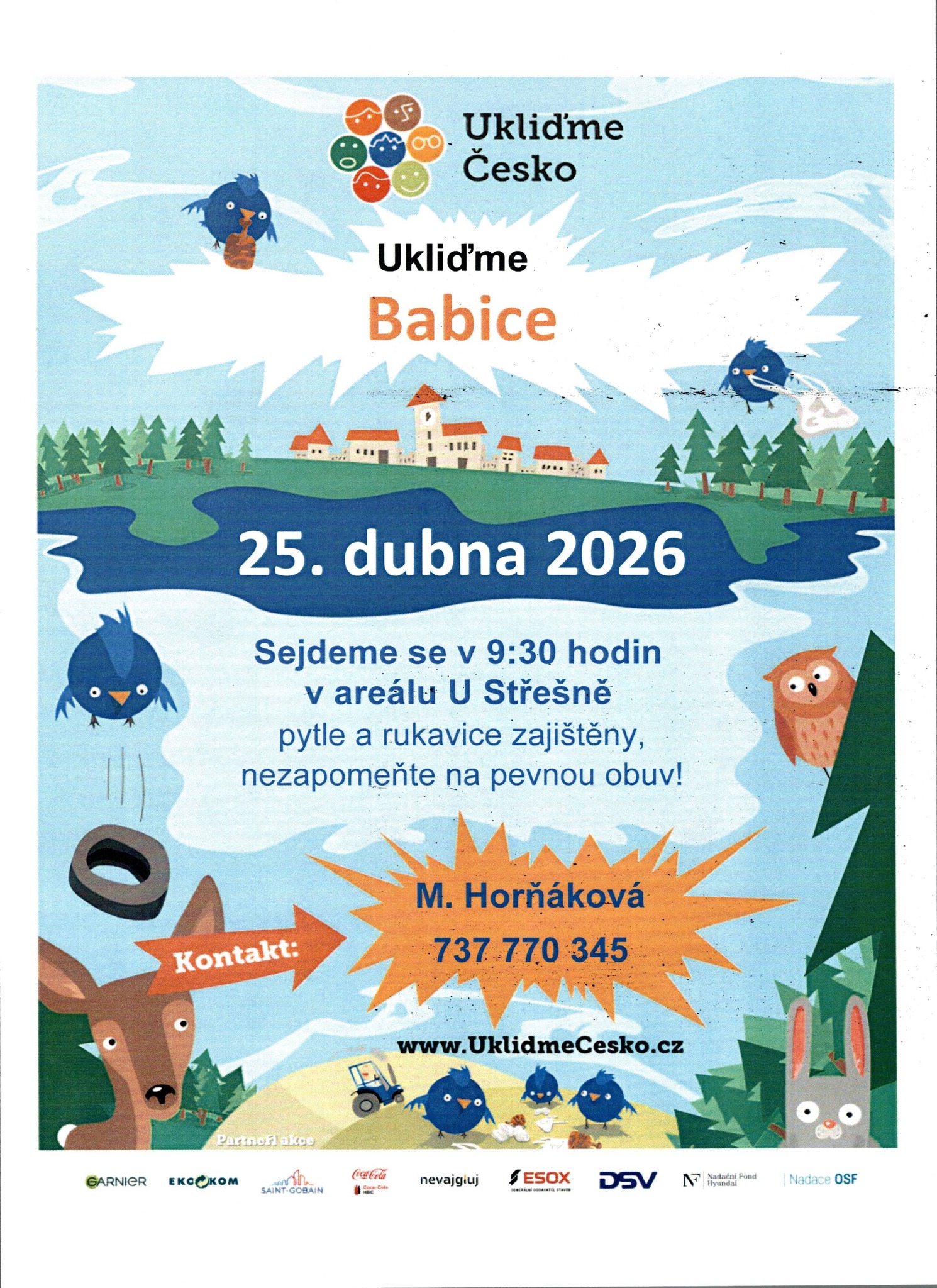V sobotu 25. 4. se uskuteční akce Ukliďme Babice. Sraz je v 9:30 hodin v areálu U Střešně, rukavice a pytle zajištěny.
