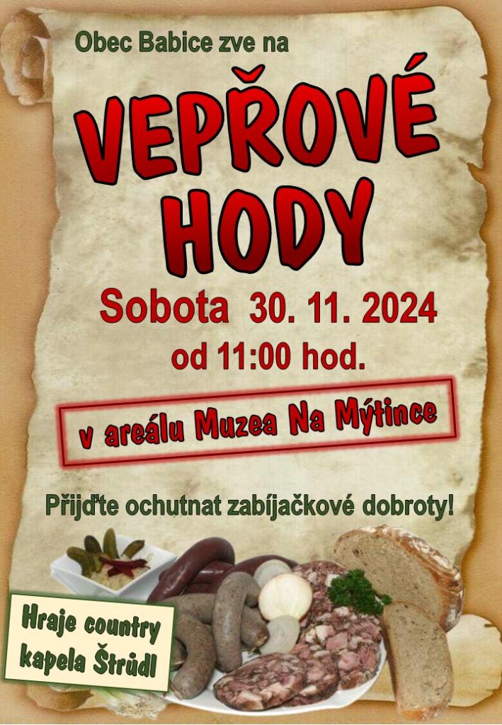 Obec Babice zve na Vepřové hody do areálu Muzea Na Mýtince.