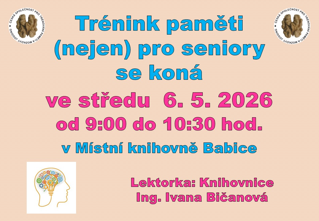 Další pokračování tréninků paměti se uskuteční ve středu dopoledne v prostoru Místní knihovny Babice.