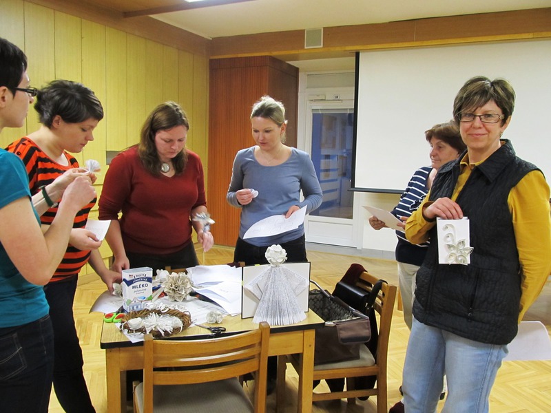 Rukodělný seminář s využitím starých knih připravila Lydie Kaštánková. Ukazovala nám různé techniky tvorby s papírem - šperky, ozdoby, dekorativní předměty..... bohužel přišlo málo lidí.